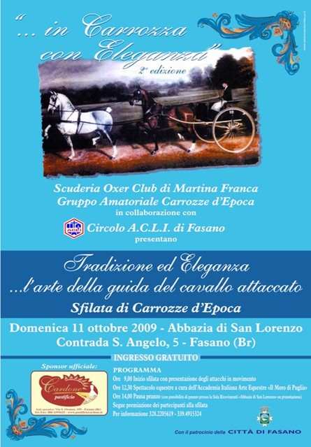 Con enorme successo , si è svolta a Fasano domenica 11 ottobre 2009 la Seconda edizione di : “in Carrozza con Eleganza” presso l’abbazia san Lorenzo .