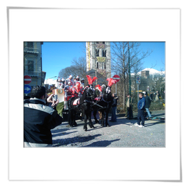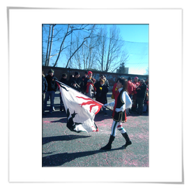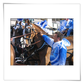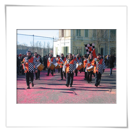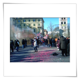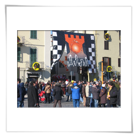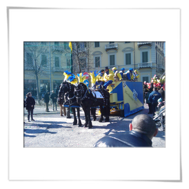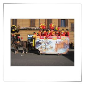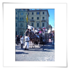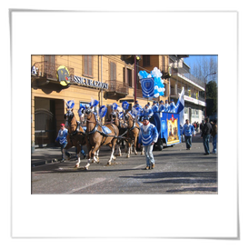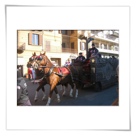 In pochissimo tempo la via si riempie di bande festanti, sbandieratori,pifferi tamburi...sembra proprio carnevale, arrivano i carri...pariglie e tiri a quattro..le squadre sopra i carri cantano inni carnevaleschi...tirano coriandoli(per il momento)..lanciano palloncini colorati..e' una festa nella festa.....