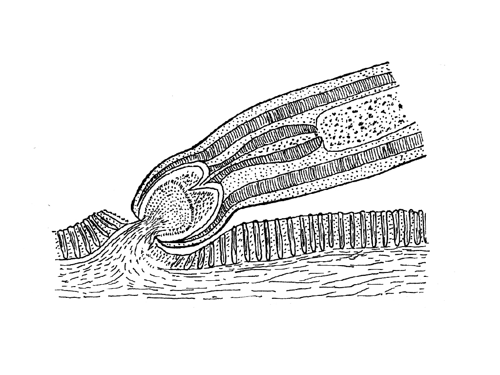 Fig.1 - Strongilo attaccato alla mucosa intestinale di un cavallo-